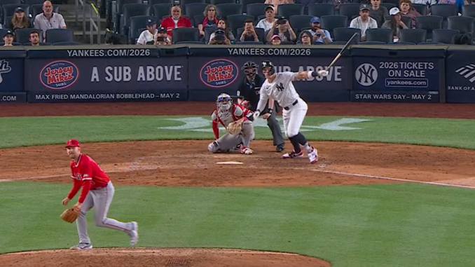 The Yanks finally got to Detmers in the bottom of the 8th — Randal Grichek led off with a double, and Austin Wells followed with a single, causing the Angels to finally go to their pen — for Chase Silseth.